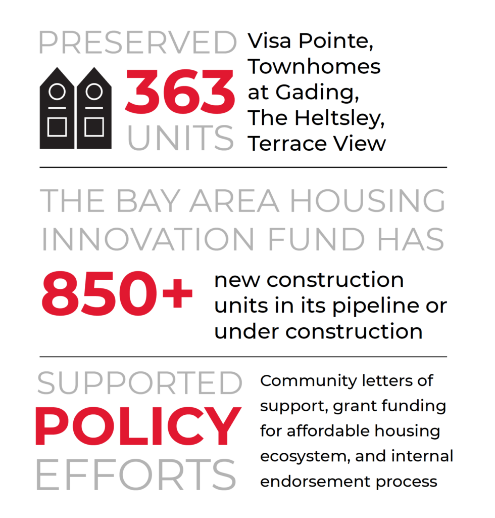 - Production – Through our impact investment tools and partnerships, we catalyze and finance the creation of new affordable housing across the San Francisco Bay Area, where affordable options lag far behind demand. This impacts many residents including essential workers—nurses, teachers, first responders, grocery clerks—who need local housing to stay in their communities.