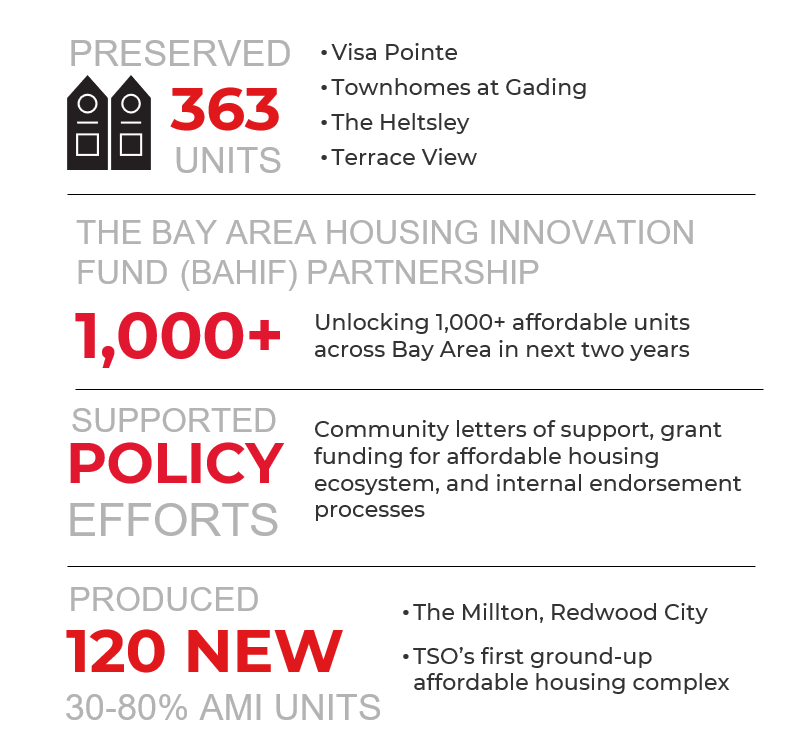HSI leverages the unique power of TSO by bringing together its Sobrato Real Estate, Capital, and Philanthropies groups to take a holistic approach and use all the tools at our disposal for greater impact and alignment to our core values. This integrated model allows us to address housing insecurity from multiple angles at once: